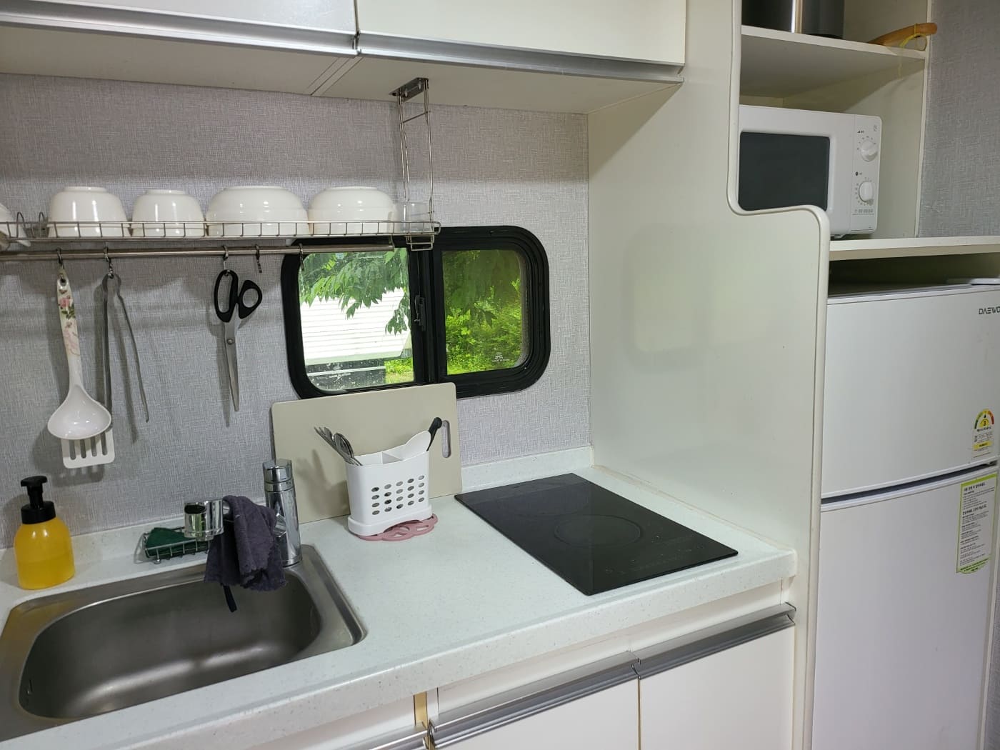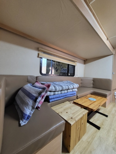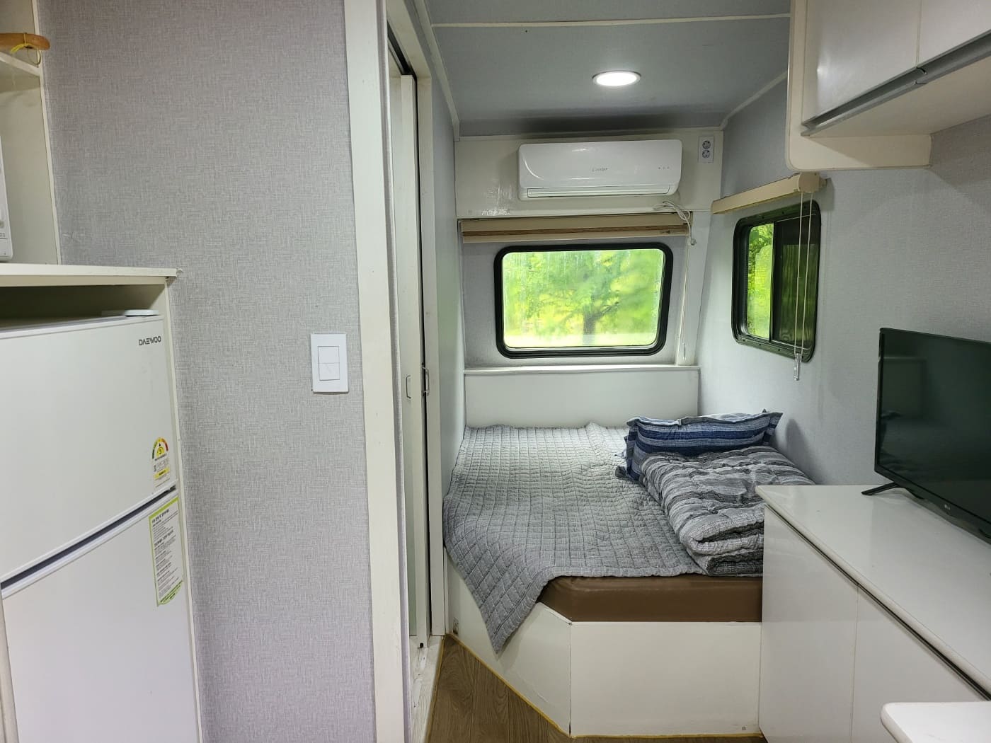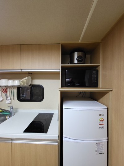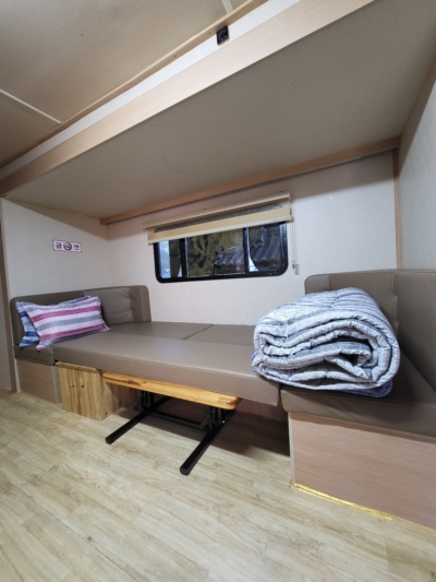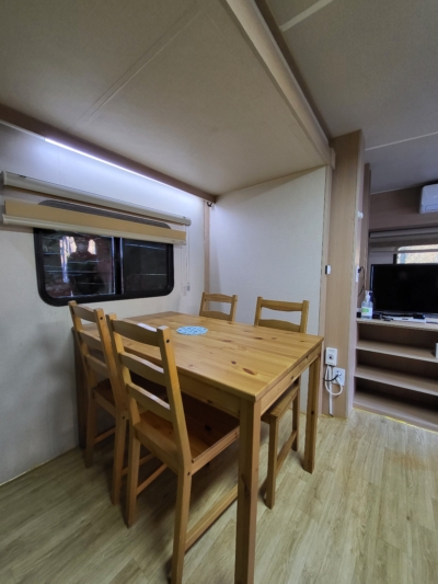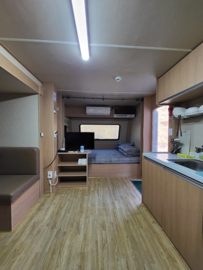 카라반 내부에 TV와 넓직한 침대, 벽걸이 에어컨이 설치되어 있으며, 가볍게 즐기실 수 있도록 주방도구와 인덕션, 전자밥솥, 전자레인지, 냉장고, 샤워실, 화장실 등이 준비되어 있습니다.