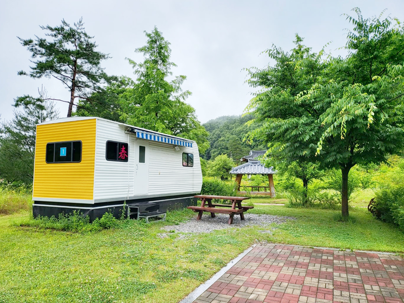 카라반 옆 야외테이블에서 오붓한 시간을 즐기세요.